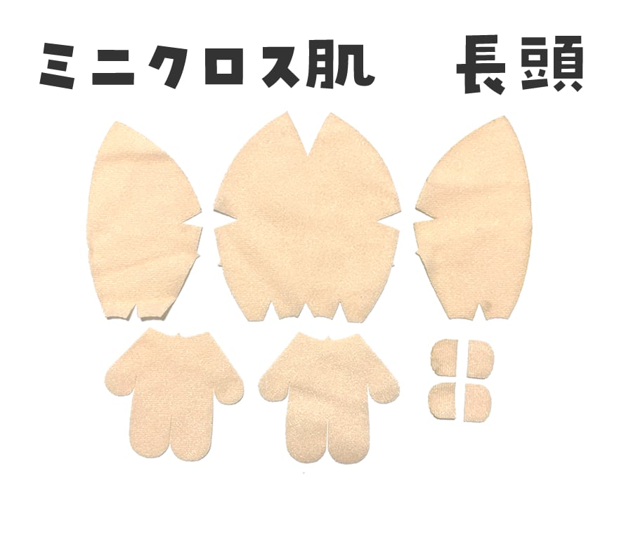ぬいぐるみプレーンボディの型紙です。丸頭、長頭、平頭の3種を1枚の型紙に印刷しています(身体部分と耳は共通)