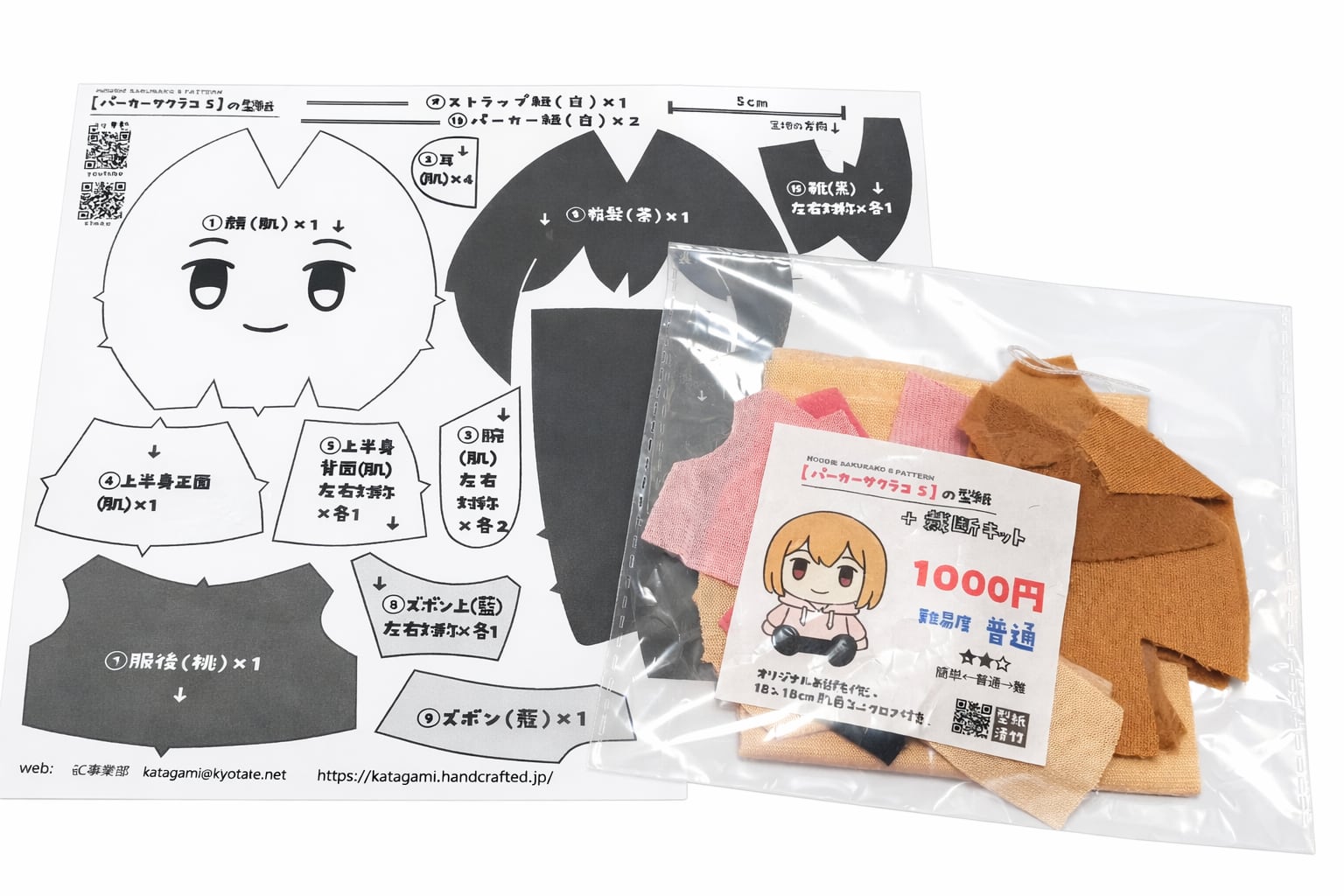 顔部分には刺繍、パーカー部分には転写印刷が入っており、組み立てることで「パーカーサクラコ」と同じ仕様のぬいぐるみを作ることができます。