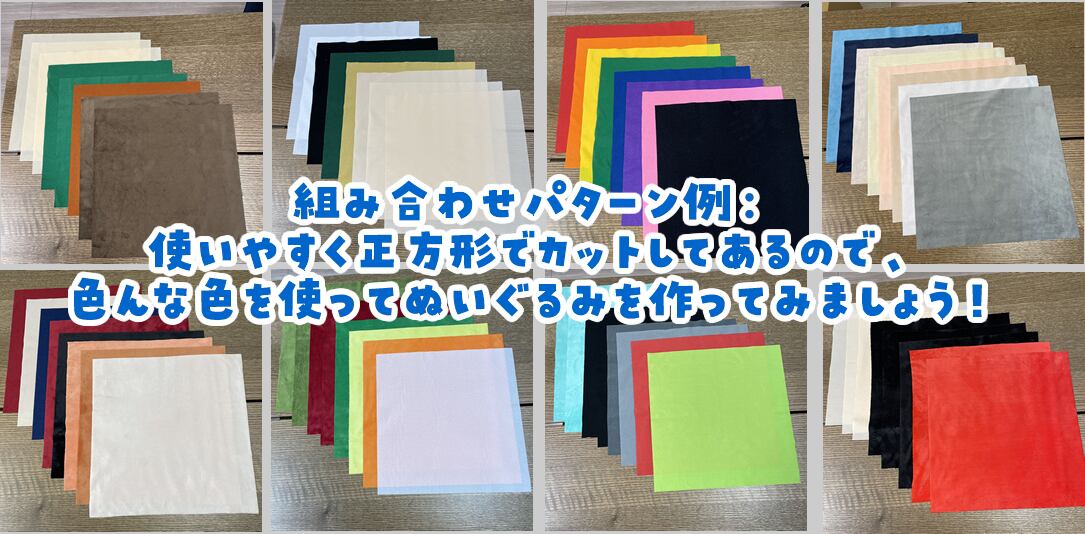 小型〜中型のぬいぐるみ、人型ぬいぐるみであれば本体の皮膚部分や服の部分によく使用されます。